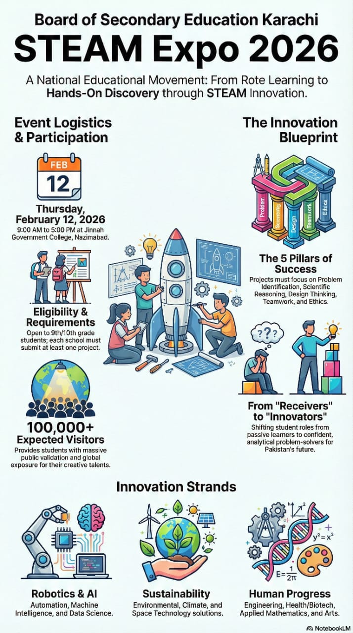 بورڈ آف سیکنڈری ایجوکیشن کراچی (BSEK) نے نجی اسکولوں کی مینجمنٹ کی تنظیم (OPSM) کے تعاون سے "اسٹیم ایکسپو 2026" کے انعقاد کا اعلان کیا ہے۔ یہ پروگرام محض ایک نمائش نہیں بلکہ تعلیمی اصلاحات اور جدت طرازی کی ایک قومی تحریک ہے۔